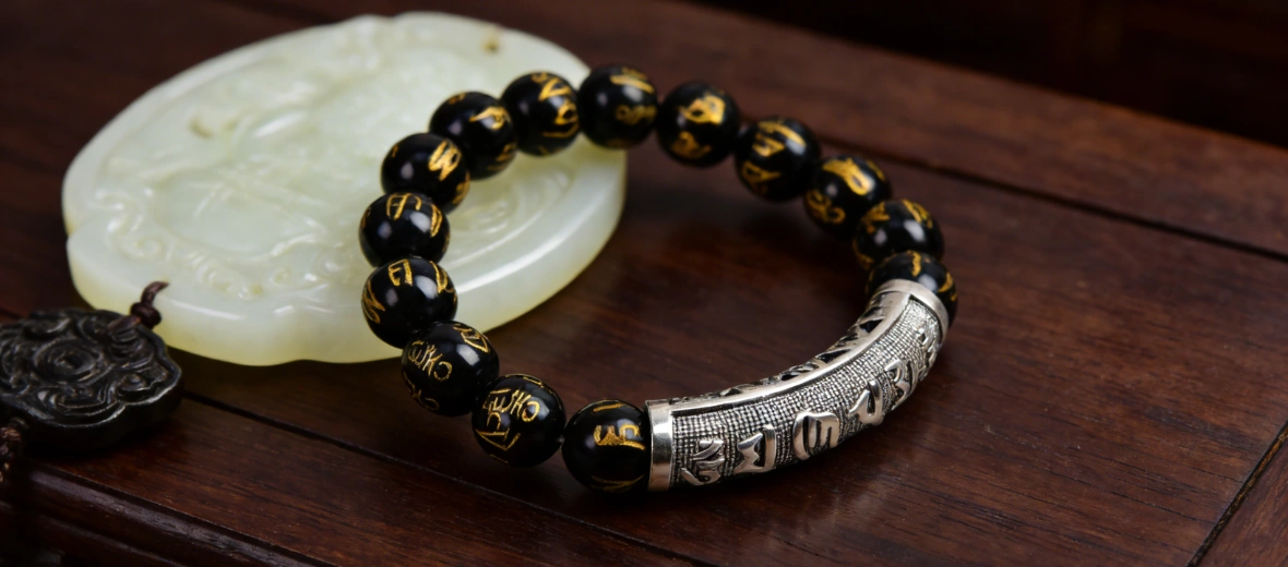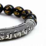 Obsidian has been revered across civilizations as a powerful protective stone, believed to absorb negative energy and ground the spirit in times of stress. Each bead is etched with traditional mantra script, adding an ancient layer of spiritual intention to this modern accessory, a quiet talisman to keep you centered and protected through life’s chaos.