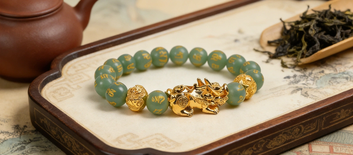 Each bead is etched with ancient blessing mantras, adding layers of spiritual intention, while the polished gold-toned Pixiu and accent beads bring a luxurious touch to the serene green hue.